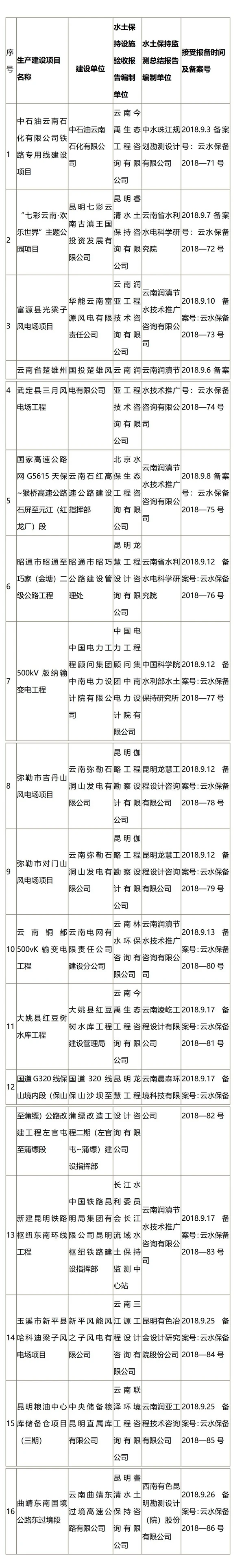 根据《水利部关于加强事中事后监管规范生产建设项目水土保持设施自主验收的通知》(水保〔2017〕365号)、《云南省水利厅转发水利部关于加强事中事后监管规范生产建设项目水土保持设施自主验收文件的通知》(云水保〔2017〕97号)的有关规定,2018年9月份我厅接受了16个生产建设项目水土保持设施自主验收报备,现将有关情况予以公告。