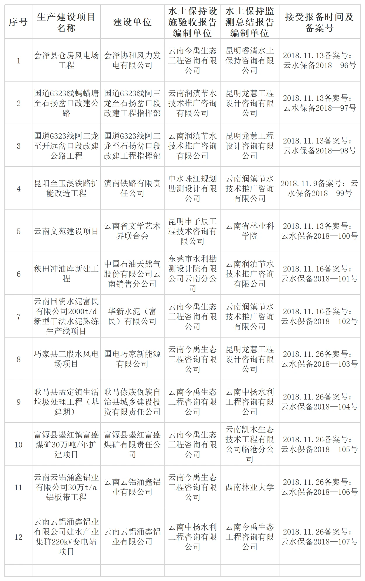 云南省水利厅关于2018年11月份接受生产建设项目水土保持设施自主验收报备的公告