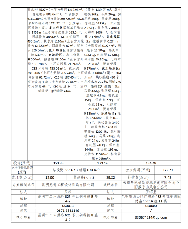 一、红河州个旧市猴子山风电场项目位于红河哈尼族彝族自治州个旧市东南部。项目装机容量为200兆瓦,项目主要建设内容包括安装32台单机容量为6250千瓦的机组;配套建设一座110千伏升压站;建设集电线路总长为30.6千米,包括地埋电缆13.69千米(其中9.35千米线路沿个旧市老场镇机耕道路工程规划的道路敷设,4.34千米线路沿个旧市老场镇黄冲线道路提升改造工程规划的道路敷设,以上水土流失防治责任不纳入本项目),35千伏架空集电线路约16.91千米,本项目通过9回35千伏架空集电线路连接至升压站;布设一处施工场地,1个弃渣场。