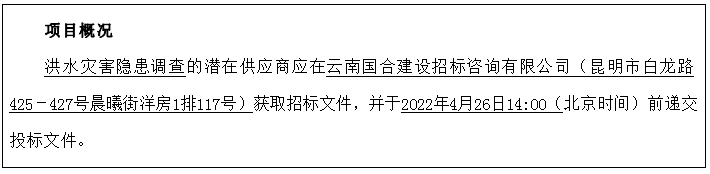 5.采购需求:本次洪水灾害隐患调查范围为云南省16个州(市)、129个县(市),以省级、州(市)级、县(市)级工程安全评价/鉴定、运行管理等资料为基础,调查水库工程、水闸工程、堤防工程等存在的隐患,编制调查报告(包括附表成果),并在工作底图上标绘水库、水闸、提防位置信息;具体的技术需求或服务要求详见招标文件“第六章采购需求”。