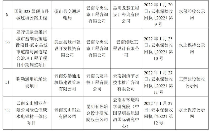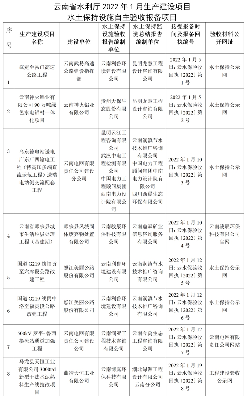 根据《水利部关于加强事中事后监管规范生产建设项目水土保持设施自主验收的通知》(水保〔2017〕365号)、《水利部办公厅关于印发生产建设项目水土保持监督管理办法的通知》(办水保〔2019〕172号)、《云南省水利厅转发水利部关于加强事中事后监管规范生产建设项目水土保持设施自主验收文件的通知》(云水保〔2017〕97号)的有关规定,2022年1月省水利厅接受了12个生产建设项目水土保持设施自主验收报备,现将有关情况予以公示。