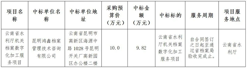 云南省水利厅机关档案数字化加工服务项目(招标编号:BK-2022ZC-3046)于2022年4月28日在云南省水利厅附楼多功能会议室完成比选工作,根据比选小组推荐,云南省水利厅确认,现对成交情况公布如下: