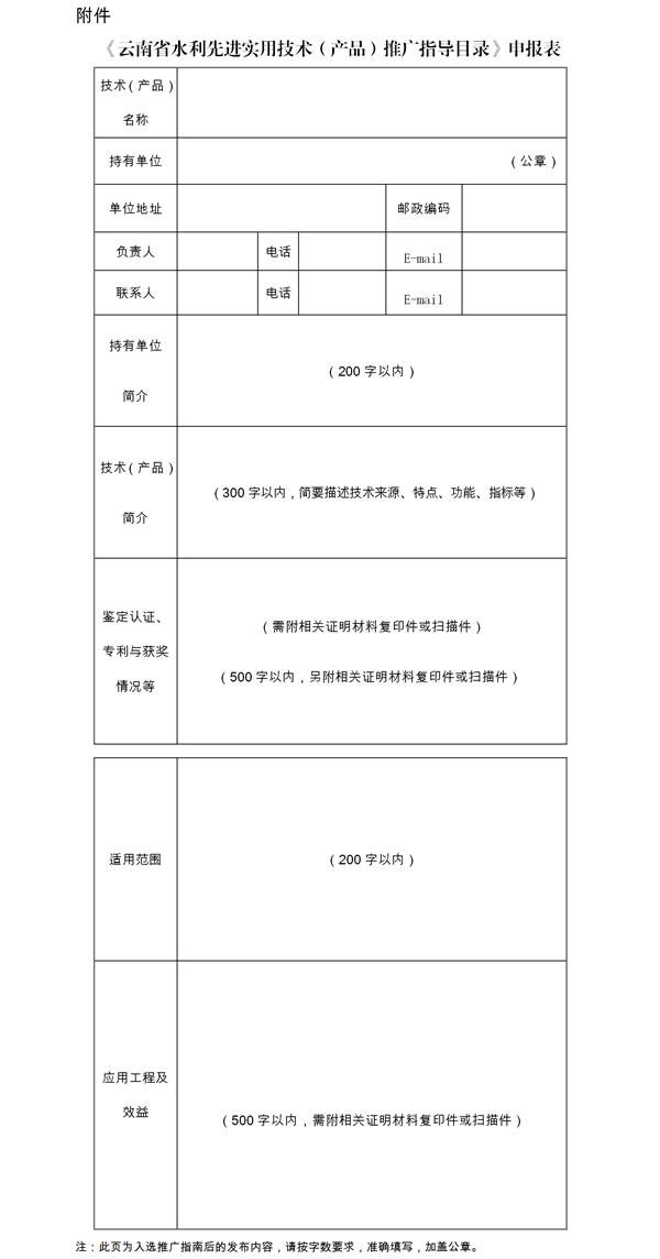 附件:《云南省水利先进实用技术(产品)推广指导目录》申报表