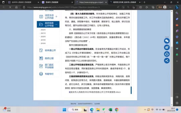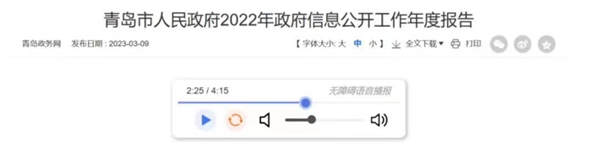一些地级市网站设有无障碍功能,其政府信息公开工作年度报告,可以变换字体大小和无障碍语音播报方式,进行观看和收听。这有助于拓宽年度报告的受众面,极大地便利了普通民众尤其是视障人士了解政府信息公开情况。如山东省青岛市、山东省滨州市、安徽省合肥市等。