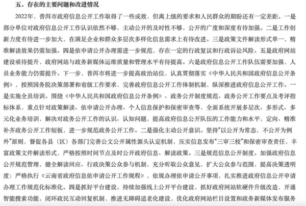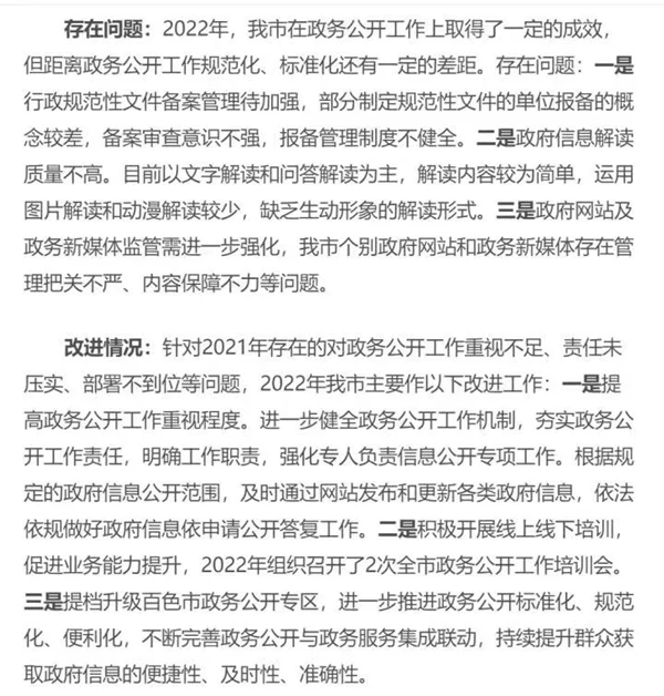不少地级市发布的政府信息公开工作年度报告内容详实,既肯定成绩,也不回避问题,针对存在的问题及改进情况进行深入剖析。如广西壮族自治区百色市、云南省普洱市等。