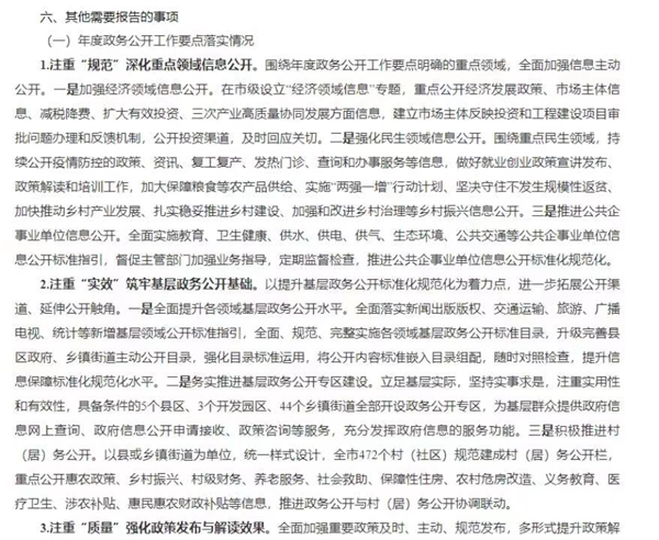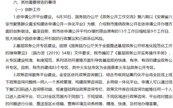 安徽省六安市、安徽省马鞍山市、安徽省池州市、安徽省安庆市等在其发布的政府信息公开工作年度报告中,针对其他需要报告事项,表述方面详尽,层次清晰,要点突出。