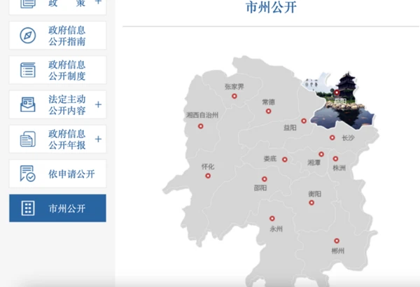 湖南省发布的市州政府信息公开工作年度报告,以湖南省地图的形式,将各市州具体的地理位置标识出来。同时,点击各市州已公开政府信息公开工作年度报告的政府,还会跳转出各市州景点照片。方便浏览人员快速定位、准确查阅政府信息,而且也展示了各地风景名胜。