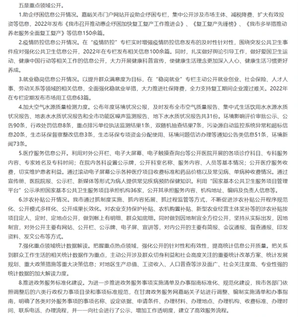 甘肃省嘉峪关市在其发布的政府信息公开工作年度报告中,对于重点领域公开,分别从八个方面介绍具体信息,列举清晰,内容详实、要点涉及诸多民生领域。