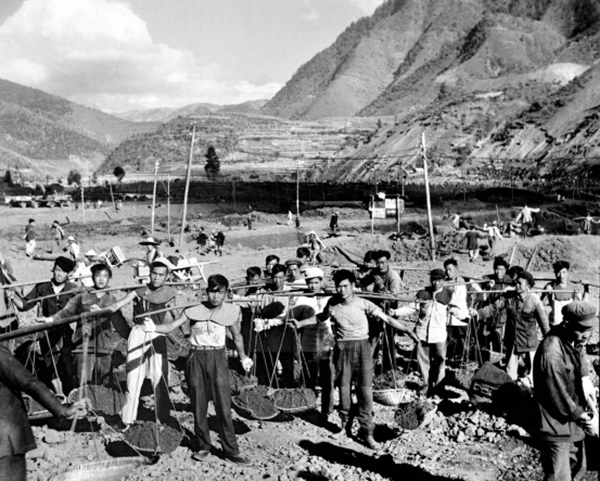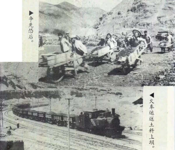 毛家村水库大坝作为以礼河梯级水电站控制性工程,由原云南省以礼河水力发电工程局一分公司承建。工程于1958年5月开工,正逢“大跃进”年代,打人海战术,人工开挖坝基施工高峰时民工达3万多人。工地上,人山人海,红旗如林,什么汽车喇叭声、广播声、吆喝声,往返尖山沟拉黏土火车的轰鸣声、汽笛声等,此起彼伏,响彻云霄。