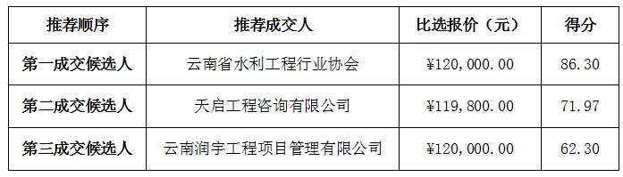 云南省水利二级造价工程师执业管理项目,于2023年8月24日14:30(北京时间)在云南省水利厅附楼会议室举行比选会议,通过比选小组评审、推荐,结合比选文件的相关规定,同时经采购人确认,确定推荐情况如下: