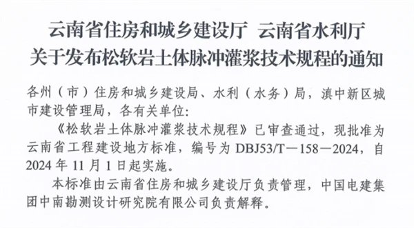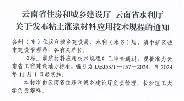近日,云南省住房和城乡建设厅、云南省水利厅批准《粘土灌浆材料应用技术规程》《松软岩土体脉冲灌浆技术规程》为云南省工程建设地方标准,2项标准2024年4月11日发布,自2024年11月1日起实施。