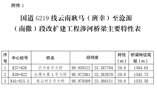 附件:1.国道G219线云南耿马(班幸)至沧源(南撒)段改扩建工程涉河桥梁主要特性表