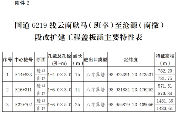 2.国道G219线云南耿马(班幸)至沧源(南撒)段改扩建工程盖板涵主要特性表