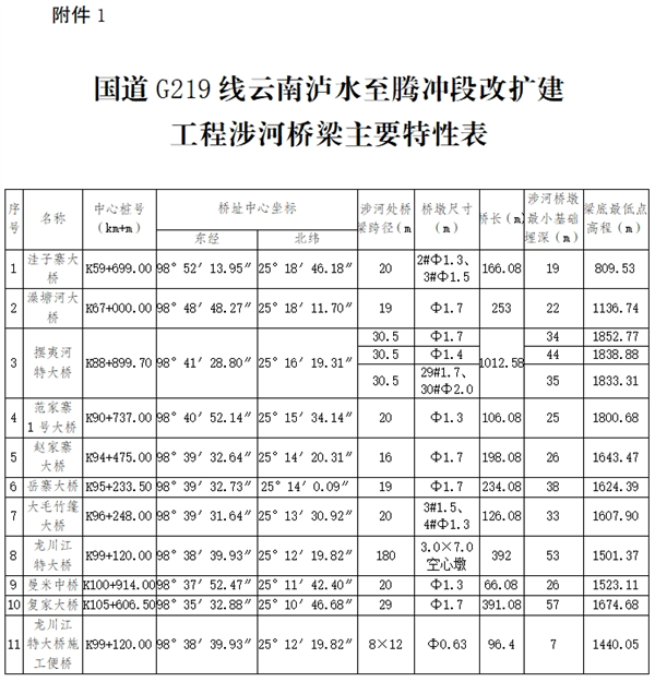 附件:1.国道G219线云南泸水至腾冲段改扩建工程涉河桥梁主要特性表