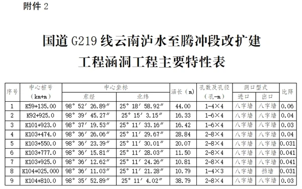 2.国道G219线云南泸水至腾冲段改扩建工程涵洞工程主要特性表
