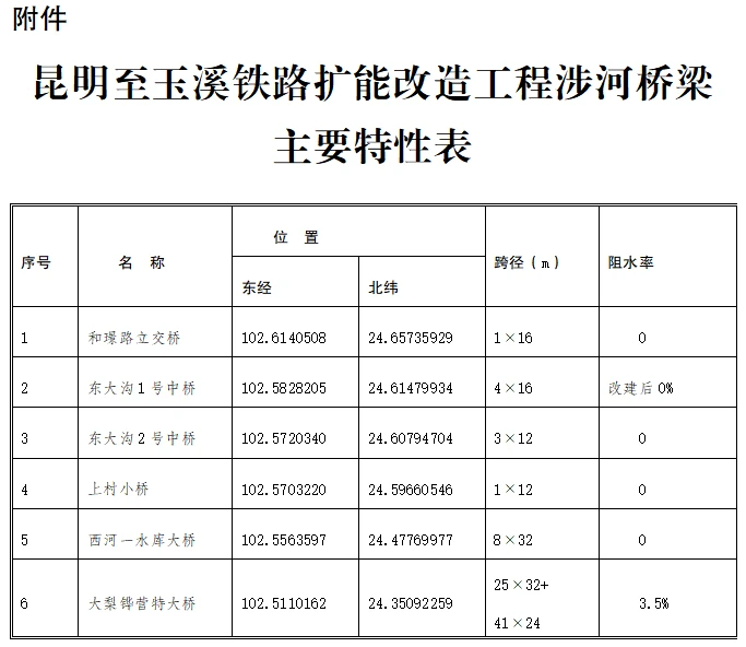 (三)新建大梨铧营特大桥工程与规划实施的玉溪大河河道整治工程存在位置交叉,在后续河道治理时,铁路部门应配合好后续工程施工,协调处理好防洪安全与工程安全。