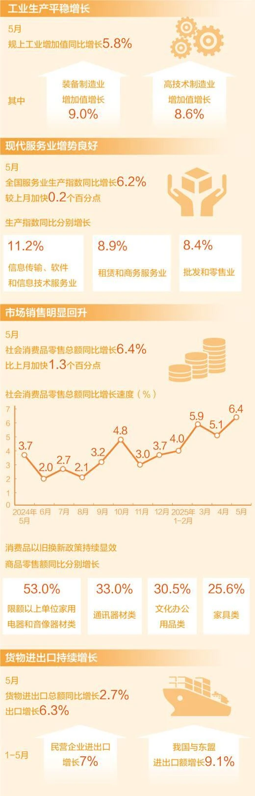 持续改善。宏观政策持续显效,国内需求扩大,生产供给增加,部分指标继续改善。5月份,社会消费品零售总额同比增长6.4%,比上月加快1.3个百分点。1至5月份,服务零售额增长5.2%,比1至4月份加快0.1个百分点。消费增长加快,尤其是服务消费扩大,拉动相关服务业增长。5月份,批发和零售业、住宿和餐饮业生产指数分别比上月加快1.6和0.9个百分点。