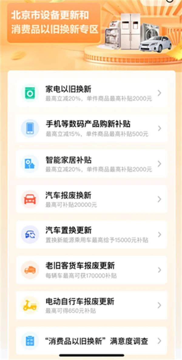 图为“京通”小程序的“北京市设备更新和消费品以旧换新专区”页面截图