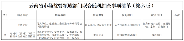 云南省市场监管领域部门联合随机抽查事项清单(第六版)