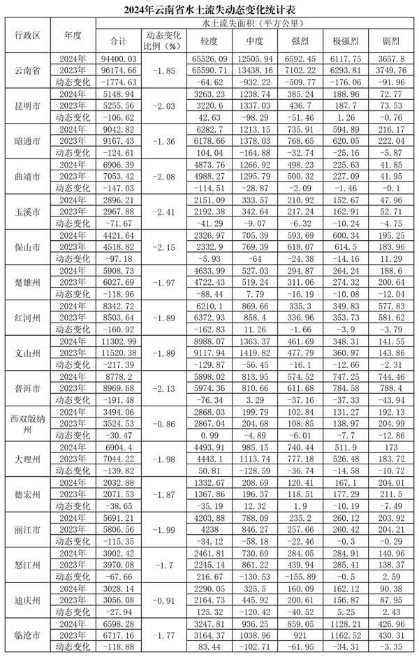 2024年云南省水土流失面积、土壤侵蚀强度均呈现下降趋势。