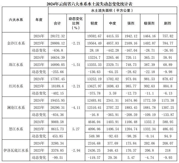 金沙江水系水土流失面积28172.32平方公里,占其流域面积109500平方公里的25.73%。与2023年相比,水土流失面积减少636.80平方公里,减幅2.21%。