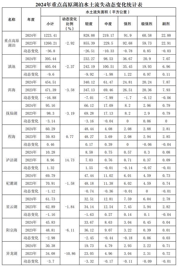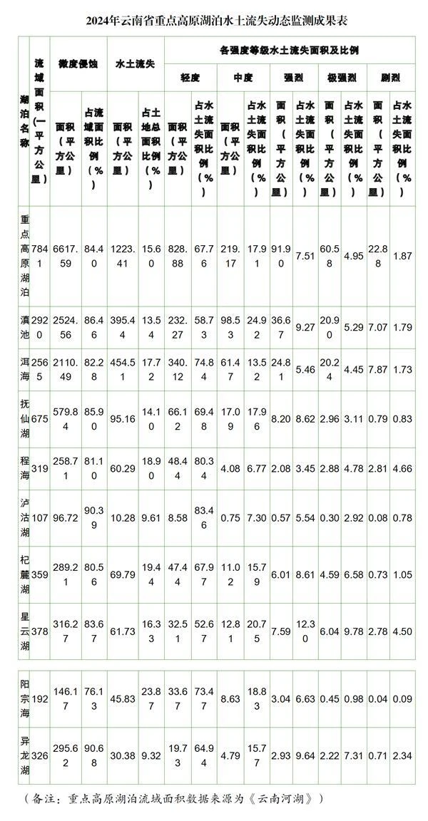 2024年,云南省重点高原湖泊水土流失面积1223.41平方公里,占其流域面积7841平方公里的15.60%。按侵蚀强度分,轻度、中度、强烈、极强烈、剧烈侵蚀面积分别为828.88平方公里、219.17平方公里、91.90平方公里、60.58平方公里、22.88平方公里,分别占其水土流失总面积的67.76%、17.91%、7.51%、4.95%、1.87%。