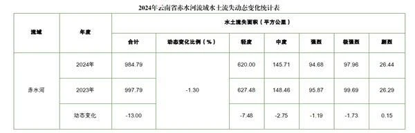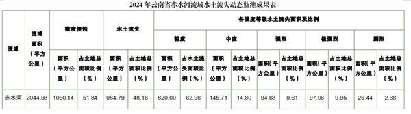 2024年,云南省赤水河流域水土流失面积984.79平方公里,占其流域面积2044.93平方公里的48.16%。按侵蚀强度分,轻度、中度、强烈、极强烈、剧烈侵蚀面积分别为620.00平方公里、145.71平方公里、94.68平方公里、97.96平方公里、26.44平方公里,分别占其水土流失总面积的62.96%、14.80%、9.61%、9.95%、2.68%。与2023年相比,水土流失面积减少13.00平方公里,减幅1.30%。
