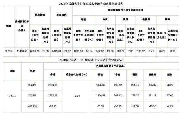 2024年,云南省牛栏江流域水土流失面积2849.04平方公里,占其流域总面积11408.40平方公里的24.97%。按侵蚀强度分,轻度、中度、强烈、极强烈、剧烈侵蚀面积分别为1895.80平方公里、592.52平方公里、226.70平方公里、105.82平方公里、28.20平方公里,分别占其水土流失总面积的66.54%、20.80%、7.96%、3.71%、0.99%。与2023年相比,水土流失面积减少26.13平方公里,减幅0.91%。