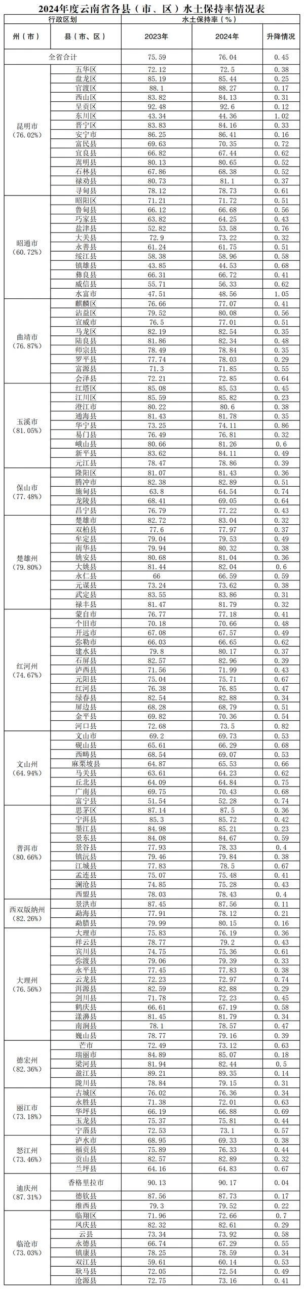 根据云南省2024年水土流失动态监测成果,云南省水土流失面积9.44万平方公里,水土保持率为76.04%,与2023年相比提高了0.45%。