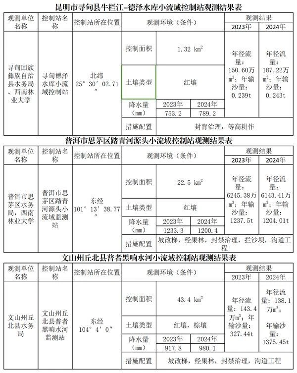 2024年,全省水土保持监测工作聚焦监测站网建设和运行管理、水土流失动态监测、信息化监管监测、生产建设项目监测管理等重点工作,全力提升监测技术服务能力。省水保监测总站印发《云南省水土保持监测站点运行管理暂行办法(试行)》,全面落实省统管、州(市)监管、县主管的监测站点运行管理责任,不断规范监测站点运行管理。按规划对监测站点布局进行优化,统筹经费确保23个监测站点正常运行。全面完成2024年度全省39.4万平方公里水土流失动态监测,不断深化拓展动态监测成果应用,及时掌握六大流域、重点高原湖泊、牛栏江、赤水河等重点区域的水土流失面积和强度变化状况。依托全国水土保持信息管理系统,督促项目建设单位和监测单位依法依规开展水土保持监测工作,落实监测“三色评价”等各项管理制度。