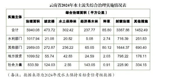 2024年,云南省水土保持工作坚持以习近平新时代中国特色社会主义思想为指导,深入贯彻党的二十大和二十届二中、三中全会精神,认真践行习近平总书记“十六字”治水思路和关于治水重要论述,围绕中共中央办公厅、国务院办公厅《关于加强新时代水土保持工作的意见》要求,健全水土保持体制机制,构建“大水保”工作格局,做到“基础扎实、监管有力、治理有效、监测全面、宣传到位”,全力推动全省水土保持高质量发展。全省水土流失面积9.44万平方公里,比2023年减少1774.63平方公里,减幅1.85%,全省水土保持率达到76.04%,水土流失面积、土壤侵蚀强度呈现双下降趋势。