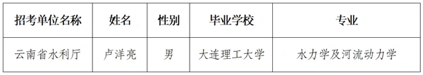 按照《云南省2025年面向选定高校招录优秀毕业生工作方案》要求,经笔试、面试、体检和考察等程序,现将省水利厅2025年面向选定高校招录优秀毕业生人员名单予以公示: