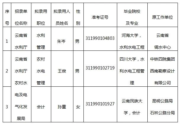 根据《中华人民共和国公务员法》《公务员录用规定》《云南省公务员录用实施办法(试行)》等有关法律法规规章,按照《云南省2025年度考试录用公务员工作实施方案》,经笔试、资格复审、面试、体检、考察等程序,现将云南省水利厅2025年度考试录用公务员拟录用人员予以公示: