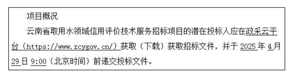 采购需求:云南省取用水领域信用评价技术服务采购,建立云南省取用水领域信用评价体系,实现对取用水单位的信用评价和管理;提供信用评价数据支持,促进取用水领域的诚信体系建设;通过信用评价结果,推动取用水单位遵守相关法律法规,减少违规行为;为政府监管部门提供决策支持,优化取用水资源配置。本项目不划分标段。