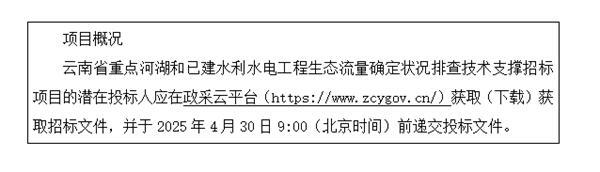 采购需求:云南省重点河湖和已建水利水电工程生态流量确定状况排查技术支撑采购,①采购标的为完成云南省河湖和已建水利水电工程生态流量确定状况排查工作;②供应商应按照云南省水利厅的要求,按时完成项目任务,并将排查成果提交云南省水利厅。本项目不划分标段。