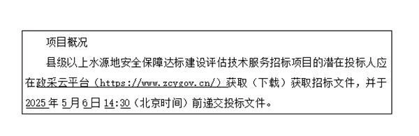 采购需求:县级以上水源地安全保障达标建设评估技术服务采购,①采购标的为完成云南省县级以上城市重要集中式饮用水水源地安全保障达标建设评估工作;②供应商应按照云南省水利厅的要求,按时完成项目任务,并将排查成果提交云南省水利厅。本项目不划分标段。