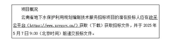采购需求:云南省地下水保护利用规划编制技术服务采购,①采购标的为完成云南省地下水保护利用规划报告,并完成评审;②供应商应按照云南省水利厅的要求,按时完成项目评审,并将报告、正式的评审意见提交云南省水利厅。本项目不划分标段。