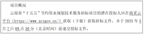 采购需求:云南省“十五五”节约用水规划技术服务采购,①采购标的为完成云南省“十五五”节水型社会建设规划报告,并完成评审。②供应商应按照云南省水利厅的要求,按时完成项目评审,并将报告、正式的评审意见提交云南省水利厅。本项目不划分标段。