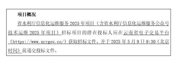 采购需求:省水利厅信息化运维服务2025年项目(含省水利厅信息化运维服务公众号技术运维2025年项目),主要服务内容包括:“云南水利”微信公众号维护;云南省水库运行管理平台运维、内网和视频运维、九湖监控点(200个)通信及运维、大数据及应用运维(含防汛驾驶舱)、OA办公系统运维、“一网通办”数据推送系统运维、水工程信息采集系统软件运维、云南省防汛抗旱指挥系统二期平台运维等。