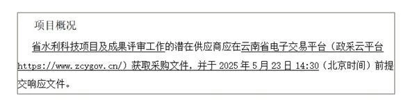 采购需求:省水利科技项目及成果评审工作,包括:①按照《云南省水利科技项目管理办法(试行)》的相关规定,组织邀请有关专家,对2025年度“云南省水利科技项目”的申报立项、结题验收开展专家评审工作。②根据工作安排,邀请有关专家对2025年度省水利厅拟申报、推荐的各层次水利科技项目、奖项及成果,开展专家评审工作。③组织邀请有关专家,对申报“云南省2025年度水利先进实用技术(产品)推广指导目录”的技术(产品)进行专家遴选评审工作1次,遴选结果报送省水利厅科技外事处开展认定等服务。