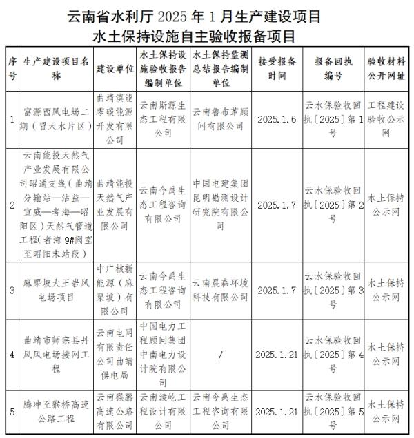 根据《水利部关于加强事中事后监管规范生产建设项目水土保持设施自主验收的通知》(水保〔2017〕365号)、《水利部办公厅关于印发生产建设项目水土保持监督管理办法的通知》(办水保〔2019〕172号)、《云南省水利厅转发水利部关于加强事中事后监管规范生产建设项目水土保持设施自主验收文件的通知》(云水保〔2017〕97号)的有关规定,2025年1月省水利厅接受了5个生产建设项目水土保持设施自主验收报备,现将有关情况予以公示。
