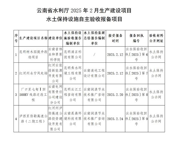 根据《水利部关于加强事中事后监管规范生产建设项目水土保持设施自主验收的通知》(水保〔2017〕365号)、《水利部办公厅关于印发生产建设项目水土保持监督管理办法的通知》(办水保〔2019〕172号)、《云南省水利厅转发水利部关于加强事中事后监管规范生产建设项目水土保持设施自主验收文件的通知》(云水保〔2017〕97号)的有关规定,2025年2月省水利厅接受了4个生产建设项目水土保持设施自主验收报备,现将有关情况予以公示。