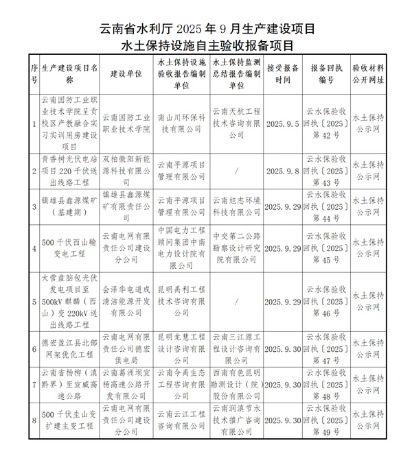 根据《水利部关于加强事中事后监管规范生产建设项目水土保持设施自主验收的通知》(水保〔2017〕365号)、《水利部办公厅关于印发生产建设项目水土保持监督管理办法的通知》(办水保〔2019〕172号)、《云南省水利厅转发水利部关于加强事中事后监管规范生产建设项目水土保持设施自主验收文件的通知》(云水保〔2017〕97号)的有关规定,2025年9月省水利厅接受了8个生产建设项目水土保持设施自主验收报备,现将有关情况予以公示。