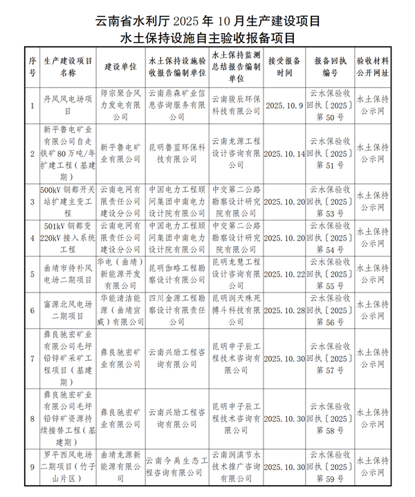 按照《生产建设项目水土保持方案管理办法》(水利部令第53号)、《水利部关于加强事中事后监管规范生产建设项目水土保持设施自主验收的通知》(水保〔2017〕365号)、《云南省水利厅转发水利部关于加强事中事后监管规范生产建设项目水土保持设施自主验收文件的通知》(云水保〔2017〕97号)的有关要求,2025年10月省水利厅接受了9个生产建设项目水土保持设施自主验收报备,现将有关情况予以公示。