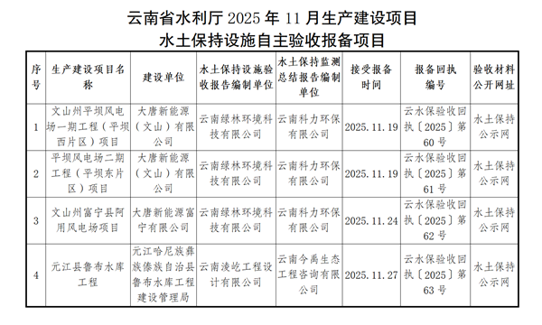 按照《生产建设项目水土保持方案管理办法》(水利部令第53号)、《水利部关于加强事中事后监管规范生产建设项目水土保持设施自主验收的通知》(水保〔2017〕365号)、《云南省水利厅转发水利部关于加强事中事后监管规范生产建设项目水土保持设施自主验收文件的通知》(云水保〔2017〕97号)的有关要求,2025年11月省水利厅接受了4个生产建设项目水土保持设施自主验收报备,现将有关情况予以公示。