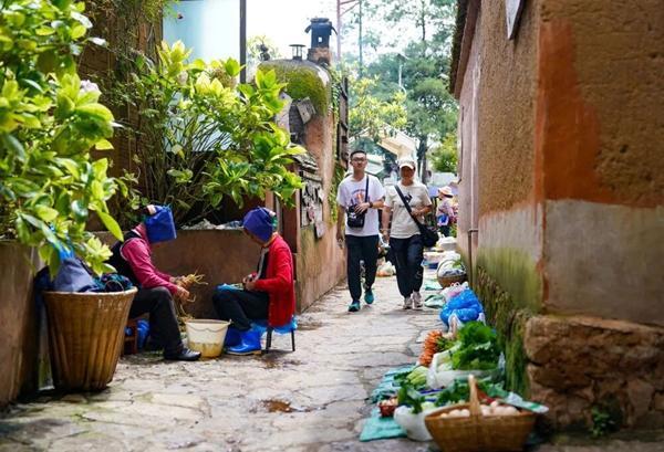 两名游客在昆明市乐居村游玩时经过村内菜市场。陈欣波 摄