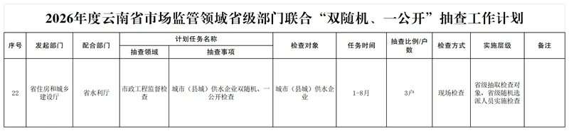 2026年度云南省市场监管领域省级部门联合“双随机、一公开”抽查工作计划